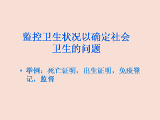 监控卫生状况以确定社会卫生问题的例子包括许多遍布全国的监督系统。当正确的使用死亡证明,出生证明和免疫登记时,所有这些反映了我们的社会卫生并允许我们根据可靠的信息采取一定的行动。