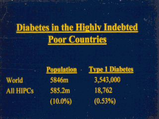 | It is prevalence of Type 1 diabetes in HIPCs. These 40 countries represent almost exactly 10% of the world population. Type 1 diabetes prevalence in these countries about 0,53% from world Type 1 prevalence. This is because diabetes incidence is much lower in tropical countries and life expectancy so short, means that the prevalence of Type 1 diabetes much lower than would be predicted from the low incidence alone. |