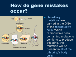 time body cells divide. Acquired mutations, also known as somatic mutations, are changes in DNA that develop throughout a person's life. In contrast to hereditary mutations, somatic mutations arise in the DNA of individual cells; the genetic errors are passed only to direct descendants of those cells. Mutations are often the result of errors that crop up during cell division, when the cell is making a copy of itself and dividing into two. Acquired mutations can also be the byproducts of environmental stresses such as radiation or toxins. Mutations occur all the time in every cell in the body. Each cell, however, has the remarkable ability to recognize mistakes and fix them before it passes them along to its descendants. But a cell's DNA repair mechanisms can fail, or be overwhelmed, or become less efficient with age. Over time, mistakes can accumulate. |