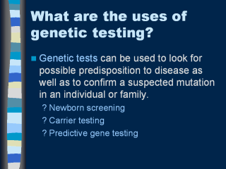 as to confirm a suspected mutation in an individual or family. The most widespread type of genetic testing is newborn screening. Each year in the United States, four million newborn infants have blood samples tested for abnormal or missing gene products. Some tests look for abnormal arrangements of the chemical bases in the gene itself, while other tests detect inborn errors of metabolism (for example, phenylketonuria) by verifying the absence of a protein that the cell needs to function normally. Carrier testing can be used to help couples to learn if they carry - and thus risk passing to their children - a recessive allele for inherited disorders such as cystic fibrosis, sickle-cell anemia, or Tay-Sachs disease (a lethal disorder of lipid metabolism). Genetic tests - biochemical, chromosomal, and DNA-based - also are widely available for the prenatal diagnosis of conditions such as Down syndrome. In clinical research programs, doctors make use of genetic tests to identify telltale DNA changes in cancer or precancer cells. Such tests can be helpful in several areas: early detection (familial adenomatous polyposis genes prompt close surveillance for colon cancer); diagnosis (different types of leukemia can be distinguished); prognosis (the product of a mutated p53 tumor-suppressor gene flags cancers that are likely to grow aggressively); and treatment (antibodies block a gene product that promotes the growth of breast cancer). Much of the current excitement in gene testing, however, centers on predictive gene testing: tests that identify people who are at risk of getting a disease, before any symptoms appear. Tests are already available in research programs for some two dozen such diseases, and as more disease genes are discovered, more gene tests can be expected. |
