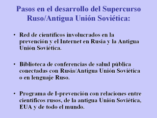 involucrados en prevención e Internet en Rusia. Segundo, fue importante establecer una gran biblioteca de conferencias en ruso en Internet. Esto es creado una columna vertebral para un programa ruso de I-prevención basado en el modelo establecido (Supercurso). |