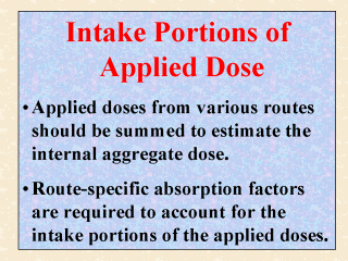 these applied doses. The typical default value for inhalation uptake is 50% or 100%, depending on the particle size involved. Inhalation uptake is referred to as the inhaled portion that is eventually brought to the lungs from the upper respiratory passage; and, as such, it is a factor more for quantifying the applied dose. The typical default for inhalation intake (i.e., that for the amount brought into the circulation from the lungs) is almost always 100% where absorption data are not available. So is the typical default for oral absorption. Both inhalation intake and oral absorption are assumed to occur (almost) instantaneously, partly due to the fact that the intestine and the lungs each have a larger surface for absorption compared to the skin (see Ross et al., 2000). For dermal absorption, the default is either 50% or 100% of the applied dose whenever chemical-specific data are not available to support the contrary. Dermal penetration and dermal acquisition are known to be more protracted when compared to the oral route or inhalation. There is evidence showing that dermal absorption varies with anatomic regions. Dermal absorption is also shown to be dose-dependent, with lower applied dose apparently having higher absorption rate. Ross et al. noticed from literature review that the rat tends to overestimate human dermal absorption by 2- to 10-fold. |