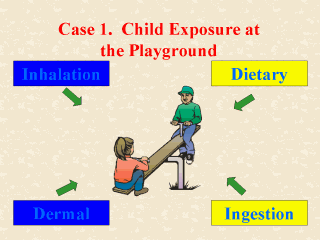 rate] x [exposure duration]. For dietary intake and ingestion of drinking water, the consumption rate is often measured as amount consumed orally per day. Thus, the last term exposure duration is usually excluded from consideration. The objective of dietary exposure assessment is to quantify the oral consumption or oral intake of the residues in foods that comprise the diets of the population under study, in this case (six-year-old) children living in a specific region. The U.S. Department of Agriculture (e.g., USDA, 1983) has provided dietary consumption estimates based on the results of a series of their Nationwide Food Consumption Survey and the Continuing Survey of Food Intakes by Individuals. Where pesticide is the chemical of concern, the residue levels for the dietary food items can be estimated from field trials, federal monitoring programs, or residue tolerances. A residue tolerance is the maximum residue concentration allowed for a specific pesticide or its metabolites in or on a particular raw agricultural commodity. In some cases, an hourly ingestion rate, rather than a daily rate, is used to estimate hand-to-mouth ingestion of (e.g., soil) residues. For hand-to-mouth ingestion of residues on treated surface, the calculation should start with determining the amount that would be loaded or transferred to the hand(s). |