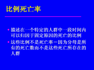 比例死亡率——当我们比较一个年龄组或者工作组和全体人口的比例死亡率时,无论是所有原因造成的死亡还是由某个特定的原因造成的,它并不直接量度人群中的一个人死于一个特定的疾病的风险和概率,正如特定原因死亡率所量度的那样。比例死亡率的差异并不反映死于一种疾病的风险,而是反映与其它死亡原因造成的死亡率之间的差异。比例死亡率在任何群体中都表现全部死亡率中一些特定的死亡原因的相对重要性。