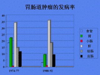 上消化道肿瘤的下降和下消化道肿瘤的升高呈鲜明的对比。较高的肝癌的发病率可能反映了肝炎