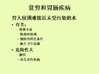 贫穷人身上。缺乏干净的饮用水可能是最明显的因素。当合并有营养不良、吸烟饮酒、拥挤的居住条件和卫生条件差,这些都增加了暴露于毒素和感染介质的机会。导致腹泻和寄生虫疾病的危险性增加,易受攻击。