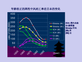 日本的男性和女在1965年都有很高的中风死亡率(年龄校正),是当时的世界上最高的