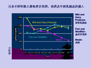 日本不同年龄人群鱼类贝壳类,肉类及牛奶乳制品的摄入。