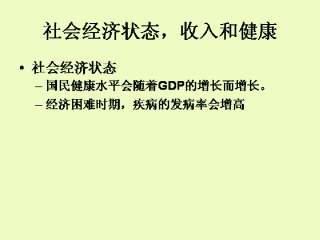 无论哪种测量方式都显示,社会经济状态与健康紧密相关。哪里的收入、受教育水平高,职业层次高,死亡率就低。反之亦然。很明显,物质资源多的地方,可以有更高的生活水平,这意味着更容易享受到保健和医疗资源。相反,当经济不景气或经济危机发生时,显示健康状态的数据也滑坡。
