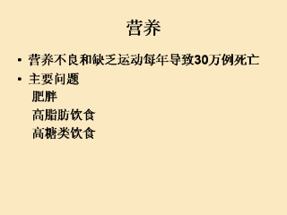 据说营养不良和不积极锻炼每年导致30万例死亡。下面一些主要方面与饮食有关。