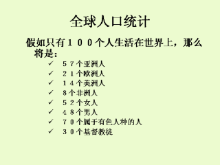 现在有将近57亿人口居住在地球上,据估计每月新增人口和纽约市的人口相同.假如现在地球上的人口缩小为100个,保持所有现存的人类比例不变,这个世界将会是这个样子的.