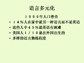 -根据1990年的人口普查,3180万美国居民,或者人口的14%在家里说另一种语言而不是英语.在这些人中,将近45%表示他们说英语有困难.