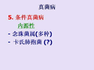 内源性 指所指真菌为人体正常菌群的一部分。外源性(见下一张)指所指真菌尽管可短暂污染人体表面(尤其是呼吸道),但并不正常寄居于人体 。卡氏肺孢菌很可能是许多动物(包括人类)肺部正常菌群的一部分。