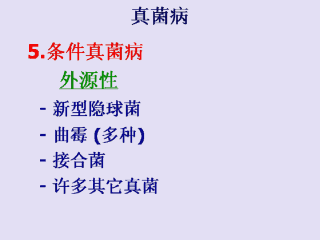 其它一些条件真菌:马尼弗()青霉菌、梭霉菌属、双极霉属、外瓶霉属、足放线病菌属、孢子丝菌属、霉样真菌属。致病性真菌(地方性病)可引起免疫功能缺陷的宿主较健康机体更为严重的感染。如果一个病人正在接受可致免疫功能缺陷的治疗,他将暴露于这些真菌中,须使用氟康唑以防真菌复活。