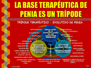 El establecimiento del trípode terapéutico se deduce de la propia fisiología del proceso de neuroplasticidad cerebral durante la organización de un aprendizaje nuevo y de considerar los elementos que resultan esenciales en la reparación neuronal del cerebro dañado. Las terapias asociadas podían ser más o menos ésas u otras que cumplan el objetivo de cada parte del trípode, su orden y momento de aplicación debe ser igualmente deducido del modelo fisiopatológico para cada caso individual. |