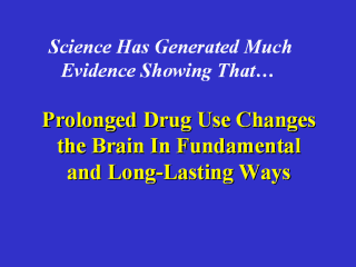 | Prolonged drug abuse changes the brain in fundamental ways that reinforce drug taking and lead to addiction. These changes are difficult to un-do and may last a long time. |