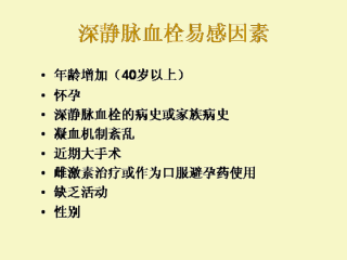 在非住院病人身上,最近进行了一项关于深静脉血栓的研究,研究揭示了该病的一些潜在易感因素。包括年龄(老年人发病率更高)、近期手术、有3次以上的怀孕经历、有该病病史以及使用雌激素(作为激素替代疗法或是口服避孕药使用)。此外,缺乏活动也被认为是血凝块产生的主导因素之一。