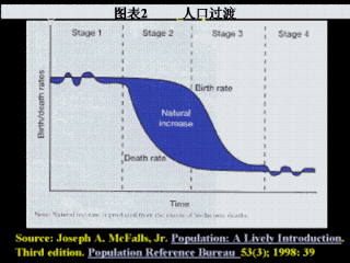 人口过渡过程被作为时间和社会经济发展程度的函数来呈现。它记录了从人口从高死亡率和出生率,并因而具有低的自然增长率的状态(第一阶段)到死亡率和出生率以及自然增长率都很低的状态(第四阶段)。第二和第三阶段因为出生和死亡率间的较大差别而具有高的自然增长率,并以次为特点。