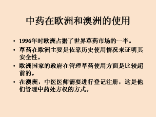 现在,澳大利亚进口了大概600到800种草药半成品进行使用,这些基本是从中国来的。在中药使用量增长如此迅猛的情况下,澳大利亚的维多利亚议会最近通过了2000年中药注册条例(2002年1月生效)来管理和分配中药。