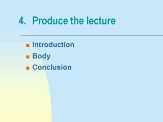any type of speaking engagement: Tell them what you are going to tell them. Tell them what you want to tell them. Tell them what you told them. This is prudent advice based on research, regardless of the topic or audience. Each lesson should have an identifiable introduction, a body and a summary of the information presented in the lecture. These three components fulfill different purposes in the learning process. |