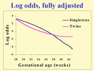 Log odds of neonatal mortality can be derived from the same logistic regression model. In singletons, neonatal mortality declined with longer GA with an accelerating rate. In contrast, the decline in twins decelerated and eventually leveled off.