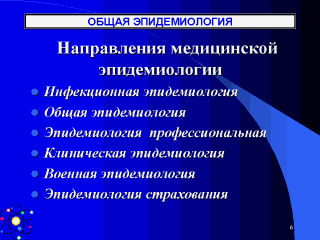 | Большее внимание эпидемиологическим исследованиях стали уделять в области клинической медицины, появилась молекулярная, генетическая эпидемиология, продолжает развиваться кардиологическая и эндокринологическая эпидемиология, а также эпидемиология в неврологии и психиатрии. |