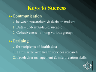 keys to successful dissemination and implementation of research findings: 1. Communication - This must be on-going. Researchers must first convert raw health data into data that are both understandable and useable by health decision-makers and service providers. - Senior-level regional personnel require data that are standardized, comparative, and longitudinal. - Communication is also necessary to establish cohesiveness and provide for the exchange of ideas and concerns, including feedback regarding the usefulness of the data and suggestions for future work. 2. Training - To make the most effective use of the data, health planners benefit greatly from basic training in epidemiology and in managing and interpreting data. Researchers can provide such training. - Teaching these skills facilitates consistency in both processes and ensure that the data can be used appropriately in making decisions. Suggestions for providing data and training data recipients will each be discussed in turn. |