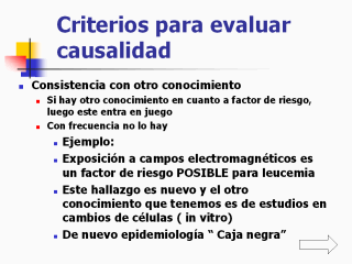 de riesgo ocurre antes del ataque de la enfermedad 2. Credibilidad biológica – algunas veces sabemos, otras no 3. La relación es verificada en estudios repetidos 4. Eliminación de explicaciones alternas: difícil de probar un efecto negativo 5. Cese de efecto: el riesgo cae en ausencia de exposición al factor de riesgo 6. Fuerza de asociación: usualmente medida a través del riesgo relativo.. Entre mayor el riesgo relativo, más probable que sea causal 7. Especificidad de la asociación : exposición específica asociada con sólo una enfermedad – No es aplicable, como se mostró en la discusión previa del esquema de causalidad, 8. Fuerte evidencia relación causal dosis-respuesta |
