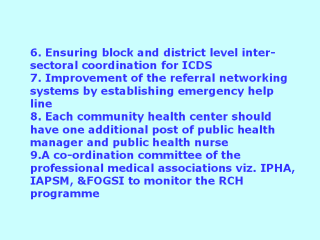 | 10.Strengthening of IEC activities. These activities should cover the following messages: Ideal age at marriage, Ideal age to have a child, Small family norm, Avoidance of higher order births, Spacing, Contraceptive acceptance, Importance of female literacy, Anaemia control, Monitoring the weight gain of mothers and growth monitoring of babies, Breast feeding and importance of colostrums, Diarrohoea management, Oral rehydration therapy, Eradication of female infanticide and foeticide, Upholding the image of girl child and women, safe delivery, Institutional delivery, Immunizations and nutrition. Propagation of messages through films, Video spots, dramas, Street plays and booklets have to be undertaken. Electronic media such as T.V. and radio have to be utilized. Audio-visual aids will be provided in medical institutions and publication of booklet on IEC activities. |