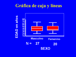 La gráfica de cajas puede ser usada para comparar los valores de variables continuas a través de las categorías de una variable discreta. Muestra la mediana, el primero y tercero cuartiles, así como los valores mínimo y máximo a través de las categorías de la variable discreta.