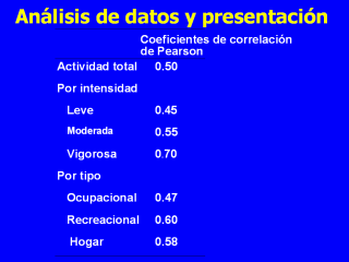 - Coeficientes de correlación de Pearson o Spearman son típicamente utilizados para describir la validez de un cuestionario de actividad física.