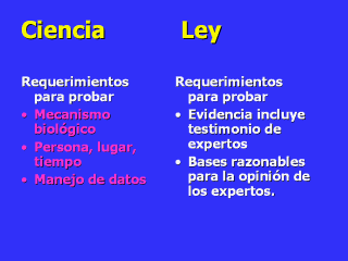 | La ciencia tiene requerimientos estrictos para probar causalidad incluyendo el mecanismo biológico relevante, características de persona, lugar y tiempo específicos y es manejada por datos válidos, reproducibles. |