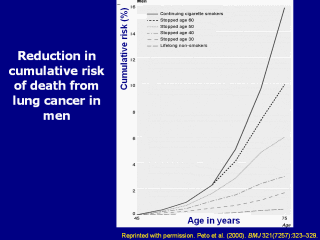 cancer. Peto R, Darby S, Deo H, Silcocks P, Whitley E, Doll R. (2000). Smoking, smoking cessation, and lung cancer in the UK since 1950: Combination of national statistics with two case-control studies. BMJ 321(7257):323–329. Slide is used with permission, Rx for Change: Clinician-Assisted Tobacco Cessation. Copyright © 1999-2007 The Regents of the University of California, University of Southern California, and Western University of Health Sciences. All rights reserved. |