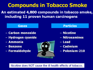 2001). Examples of detrimental compounds (some of which are carcinogens) in tobacco smoke include the following: Carbon monoxide: automobile exhaust; binds to hemoglobin, inhibits respiration Hydrogen cyanide: gas chamber poison; highly ciliotoxic, inhibits lung clearance Ammonia: floor/toilet cleaning agent; irritation of respiratory tract Nicotine : addictive substance; toxic alkaloid Benzene: solvent, banned substance in organic chemistry labs; Group I carcinogen Nitrosamines: carcinogenic in animals and probably in humans; Group 2A and 2B carcinogens Lead: heavy metal, toxic to central nervous system; Group 2B carcinogen Cadmium: heavy metal found in rechargeable batteries; Group I carcinogen Hexavalent chromium: highlighted in the movie Erin Brockovich; Group I carcinogen Arsenic: pesticide; Group I carcinogen Polonium-210: radioactive agent; Group I carcinogen Formaldehyde: embalming fluid; Group 2B carcinogen Other substances in tobacco smoke (not listed above) with sufficient evidence to be classified as Group I carcinogens in humans include 2-naphthylamine, 4-aminobiphenyl, vinyl chloride, ethylene oxide, beryllium, and nickel. Note to instructor(s): It is important to emphasize that although nicotine is the addictive component of tobacco, it does not cause the ill health effects. National Cancer Institute (NCI). (2001). Risks Associated with Low Machine-Measured Yields of Tar and Nicotine (NIH Publication No. 02-5074). Smoking and Tobacco Control Monograph No. 13. Bethesda, MD: U.S. Department of Health and Human Services, National Institutes of Health, National Cancer Institute. Slide is used with permission, Rx for Change: Clinician-Assisted Tobacco Cessation. Copyright © 1999-2007 The Regents of the University of California, University of Southern California, and Western University of Health Sciences. All rights reserved. |