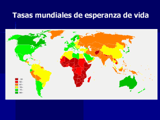 La esperanza de vida varía grandemente a través del planeta, con estimaciones tan altas de 80 años o más en Canadá y Australia, y tan bajos como 50 años o menos en la mayoría de África.