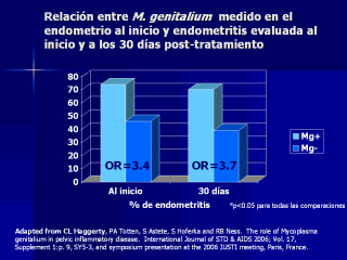 | Además, encontramos a M. genitalium asociado con endometritis al incio y 30 días después del trat6amiento con cefoxitina y doxicilina. |