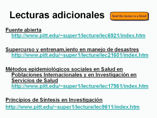 Salud Global para conferencias adicionales www.pitt.edu/~super1 Esta conferencia ha sido desarrollada por Faina Linkov, Ronald LaPorte, Eugene Shubnikov, Mita Lovalekar y el equipo del Supercurso de la Red de Salud Global. Por favor envie e.mail a super1@pitt.edu para contactar a desarrolladores. Unase al Supercurso visitando http://www.pitt.edu/~super1/assist/join.htm
