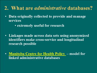 Over the last three decades, researchers at the Manitoba Centre for Health Policy(MCHP) have developed the Population Health Research Data Repository (Repository) . The repository is a comprehensive collection of administrative, registry, survey and other databases describing how Manitobans use the health care system. It was developed to describe and explain patterns of health care use and profiles of residents’ health and illness. Because it contains not only Ministry of Health data, but also data from the Ministries of Education and Family Services, inter-sectoral research across areas such as health care, education, and social services is facilitated. This repository has become a model for research using linked databases.