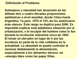 Un incremento en la ingesta de calorías acompañado de menos ejercicio causa obesidad. Necesitamos aprender más acerca de a/ el ambiente físico, b/ estilos de vida, y c/ efectos socio económicos. Cuando el alimento es abundante y económico, y las personas tales como los empleados de oficina son físicamente inactivos, se produce la obesidad.
