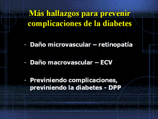 Como hemos visto con ESRD, es posible – con los hallazgos de las investigaciones apoyadas por NIH – exitosamente tratar y prevenir algunas complicaciones de la diabetes tipo 2. Me gustaría contarles un poco de nuestros éxitos en prevenir algunas complicaciones de la enfermedad.