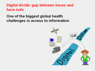 In addition to different diseases, we would like to argue that one of the biggest challenges to global health is access to information. We need to share information in the area of global health research across the digital divide. Much of clinical practice and prevention is the sharing of knowledge. If we can harness the information revolution we can have a profound effect with our patients and with the people of the world.