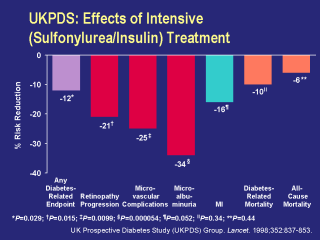 in individual therapies. Significant reductions were observed in diabetes complications in the intensively treated groups compared with the conventionally treated group. There was a reduction of 16% in MI in the intensive treatment group, which approached statistical significance (P=0.052). Analysis of the data revealed that any reduction in A1c level is predictive of benefit to patients with type 2 diabetes. American Diabetes Association. Diabetes Care. 1999;22(suppl 1):S27-S31. UK Prospective Diabetes Study (UKPDS) Group. Lancet. 1998;352:837-853. |
