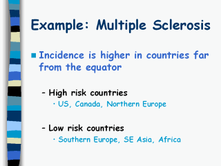 | One international example can be found in the multiple sclerosis (MS) literature. The incidence of MS varies widely across countries. The incidence of the disease is higher in countries that are far from the equator. Low risk countries are located close to the equator. |