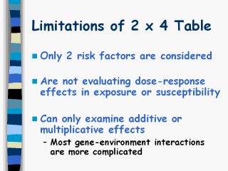 Limitations of using a 2 x 4 table to test for gene-environment interactions are described in this slide. It is likely that most gene-environment interactions are much more complicated than those that can be evaluated by examining additive or multiplicative models. Therefore, while 2 x 4 tables are easy to construct, their usefulness can be limited.