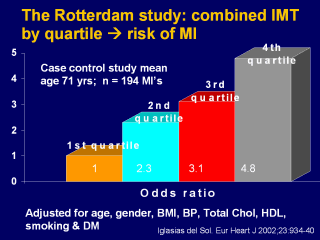 | Combined IMT- common, bifurcation, internal. This was a case control study over 4.6 yrs with 190 MI’s 5854 pts. They said each measurement predicted mi and the common far wall can be obtained on almost all pts so rec use that. |