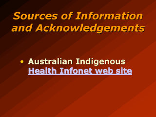 draws extensively from material presented on the Australian Indigenous Health Infonet web site. In particular, the summaries of information on health status and on social issues and indicators is gratefully acknowledged. The web site provides a great deal of information on Indigenous health. Students are encouraged to explore the web site via the hypertext links provided in this lecture, and to explore the primary sources of information used by the site. Dr Joan Cunningham’s comments on a previous version of this lecture are gratefully acknowledged. |