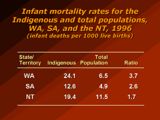 | The Indigenous infant mortality rate for Queensland, Western Australia, South Australia and the Northern Territory combined in 1998 was 15.2 infant deaths per 1,000 live births, slightly more than three times higher than the overall Australian rate of 5.0 per 1,000 |