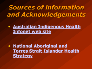 Indigenous Health Infonet web site. This site provides a wealth of information on Indigenous health, and students are encouraged to explore the site to supplement the information presented in this lecture. The second key source of information is the National Aboriginal and Torres Strait Islander Health Strategy: Draft for Discussion, February 2001. A copy of this is on the web. Students are expected to at least read the executive summary. Several other key references are also listed at the end of the lecture. Dr Joan Cunningham’s comments on a previous version of this lecture are gratefully acknowledged. |