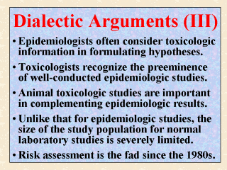 toxicologic studies in complementing the results of epidemiologic studies. The limitations and advantages of toxicology versus epidemiology were presented earlier by Nelson (1988), whose findings not surprisingly were similar to the observations noted above and in the last two slides. Nelson also pointed out that unlike that for epidemiologic studies, the size of the study population for normal laboratory studies is severely limited. About two decades ago, Frawley (1981) predicted that health risk assessment would become the fad of the 1980s. Craigmill et al. extended Frawley's prediction asserting that the fad would continue through the 1990s. This series of lectures would like to make a further extension that the fad shall prevail at least through the first decade of the 2000s, as to some extent this trend is evident from the recent developments by USEPA (1999, 2000) on aggregate and cumulative risk assessments. |