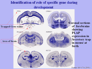 Coronal sections through the forebrains of six different example secretory-trap mouse lines at birth, showing the variety of axonal pathways labeled by the PLAP marker. The genes trapped in each case are indicated; LST16 and KST37 are examples of traps in new genes. Abbreviations: ac, anterior commissure; cc, corpus callosum; co, cortex; f, fimbria; fx, fornix; h, hippocampus; ha, habenula; pc, piriform cortex; st, striatum; str, stria terminalis. See Leighton et al. [6] for further details.